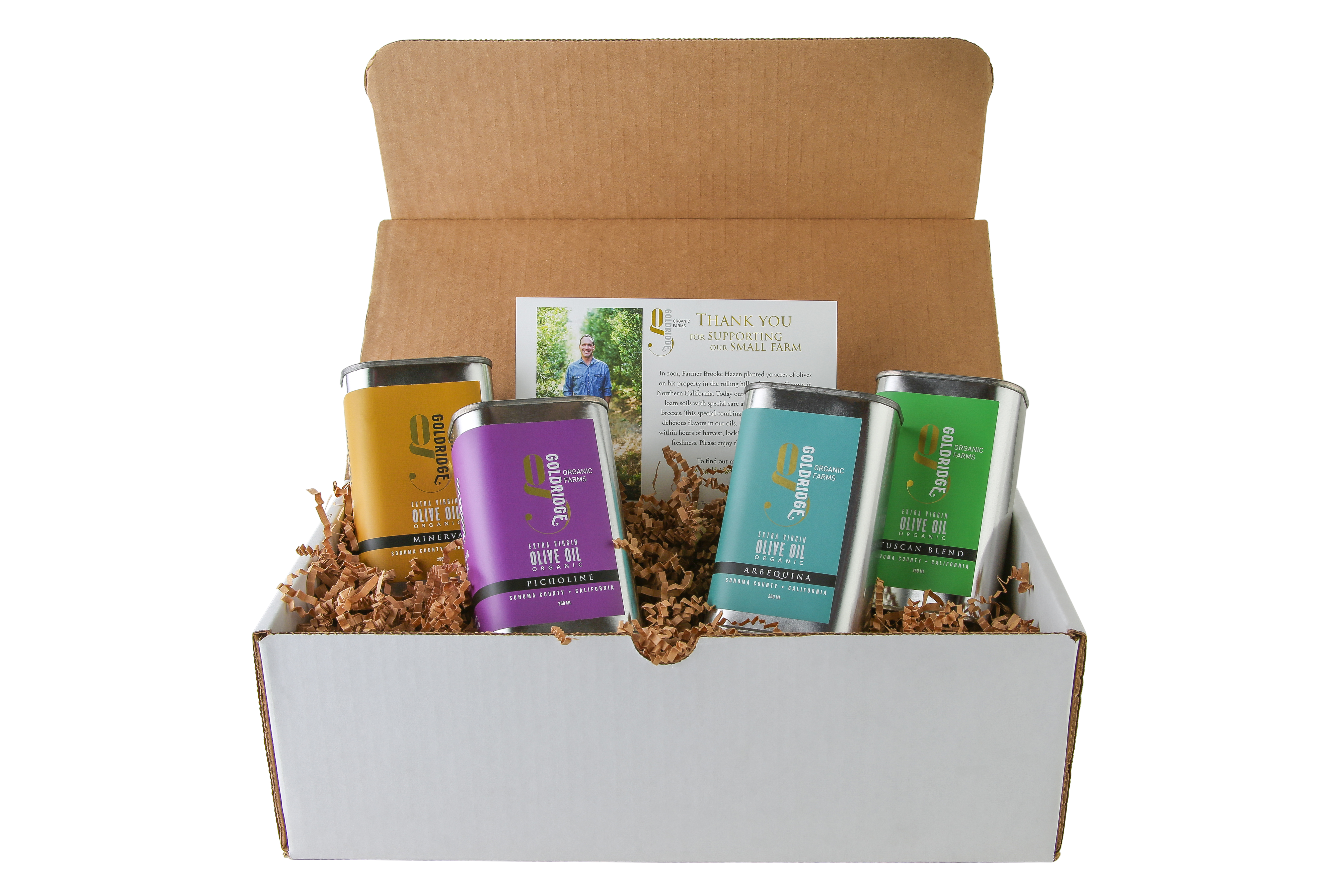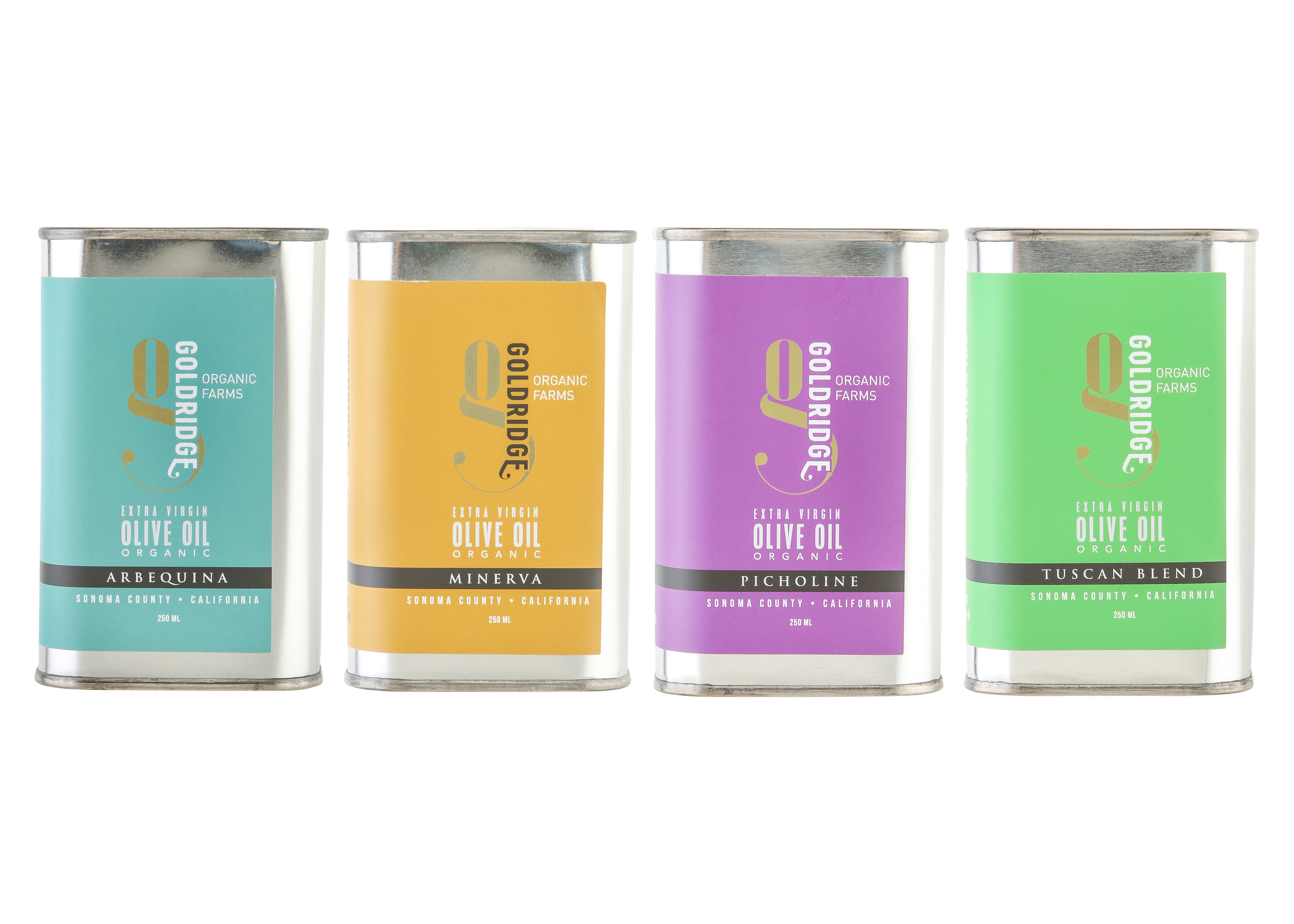 Experience each one of Gold Ridge Organic Farms four Award-Winning Organic Extra Virgin Olive Oils from Sonoma County, California in this special collection of four 250 ml tins. Great packaging plus great oils that are high in antioxidants and full of flavor.